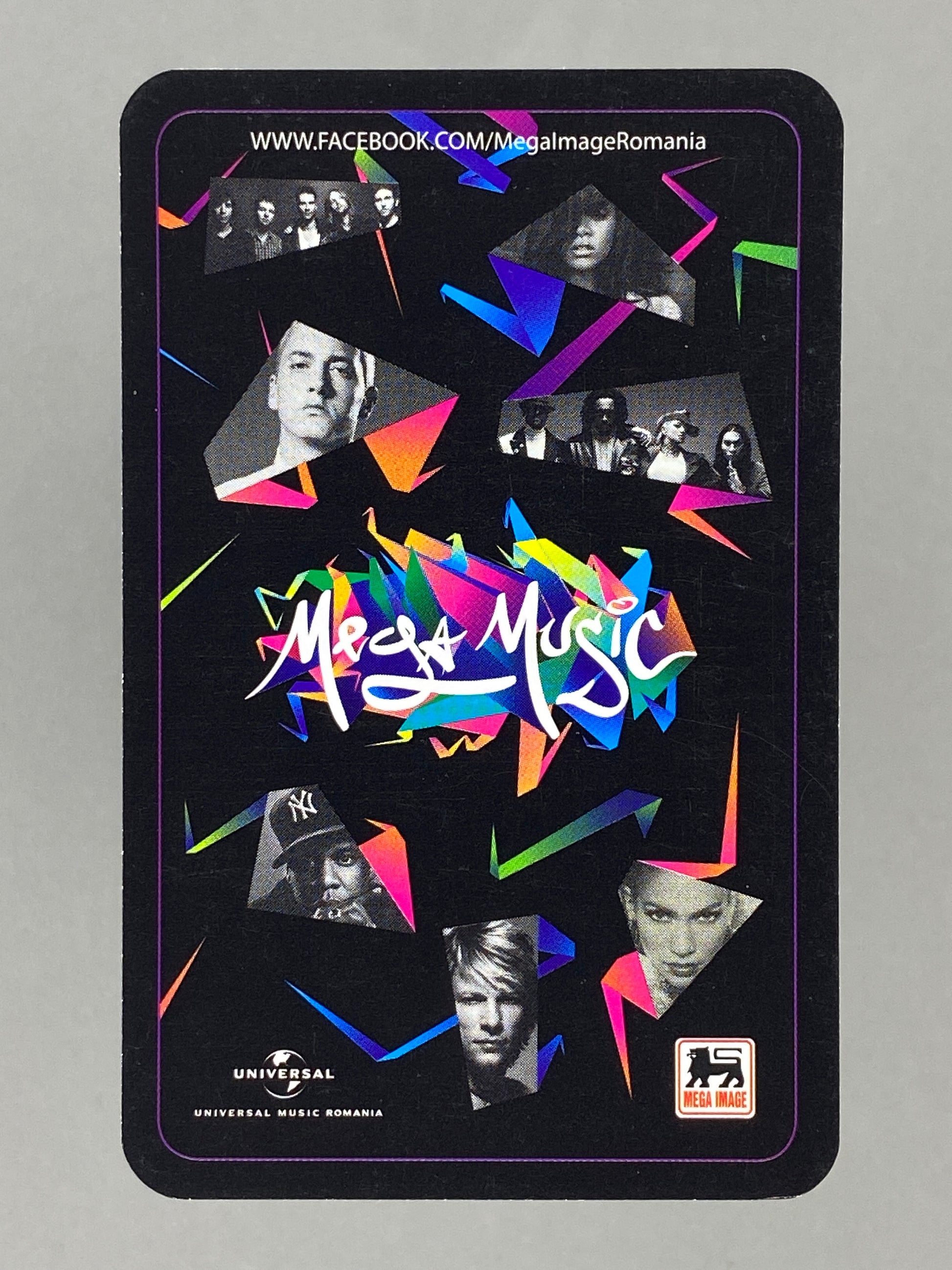 Notes About the Cards & Set: Universal Music and Mega Image Romania partnered to create Mega Music cards which were distributed in reward packs given out when products were purchased from Mega Image Stores. The promotion ran from Aug 23rd 2012 to Nov 14th 2012. The campaign was designed to attract younger customers to Mega Image. The reward packs contained 2 randomly inserted cards. There were 150 different cards in all featuring 50 of the most popular music artists of the time. There were 100 base cards (2 for each artist) and 50 silver border autograph cards (1 for each artist - facsimile autograph). There were also 12 pop art sticker cards and randomly inserted cards with codes that could be checked online to see if you won a meet and greet with one of the artists. (Romania)